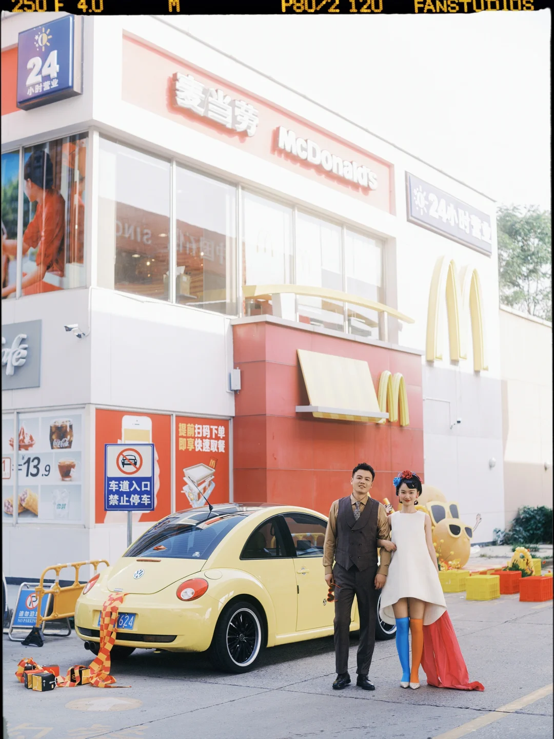 婚戒是新郎藏在薯条盒里的,从“得来速”窗口递给新娘;现场的布置不是鲜花和纱幔,而是土豆和西红柿,背景墙更是用上了麦当劳标识,而宾客餐食就是98元儿童套餐。