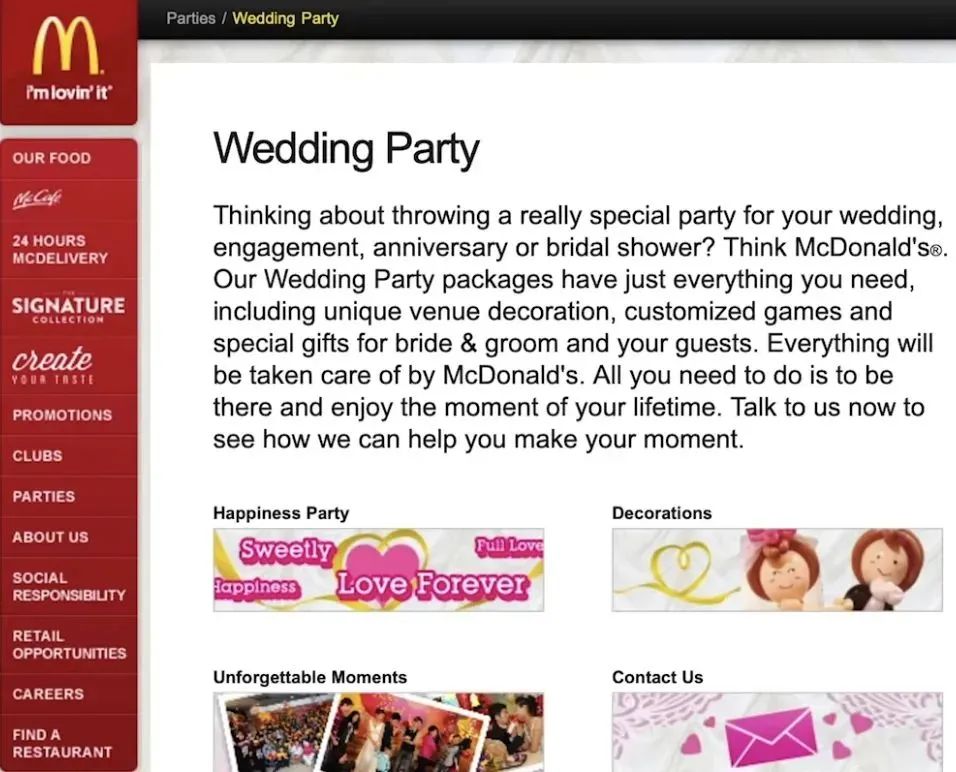 早在2011年,香港麦当劳就曾在门店开展新业务MCWedding“麦婚礼”,并做了非常详细的策划清单,准备了4个不同档次的套餐,分别是2999港币、3988港币、6688港币以及9999港币,包括了用麦乐鸡做的新娘花束。
