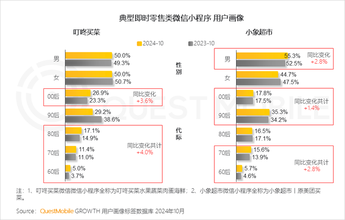 2.2 典型即时零售平台叮咚买菜、小象超市通过系列的促销活动,带动00后、70后、60后微信小程序人群比例均有小幅提升