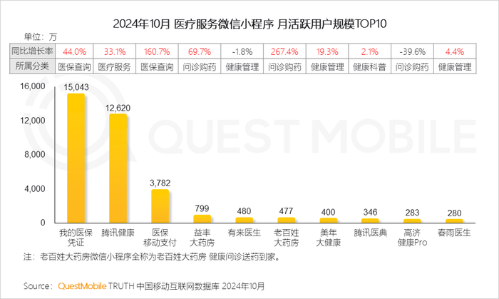 QuestMobile数据显示,用户对于在线查询医保、在线购买药品及医护用品、健康科普需求集中,促进平台用户规模同比增长。