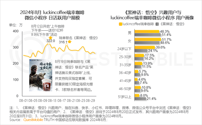 7、瑞幸咖啡把握市场热点,在《黑神话:悟空》正式发布前一天推出联名咖啡套餐,8月19日当日流量达到316万