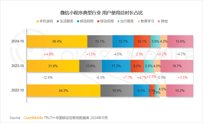 6、微信小游戏抢占用户时长占比最高的应用类型且同比增长4.8%,此外,用户的注意力依旧向移动视频集中,该行业总时长占比持续保持增长