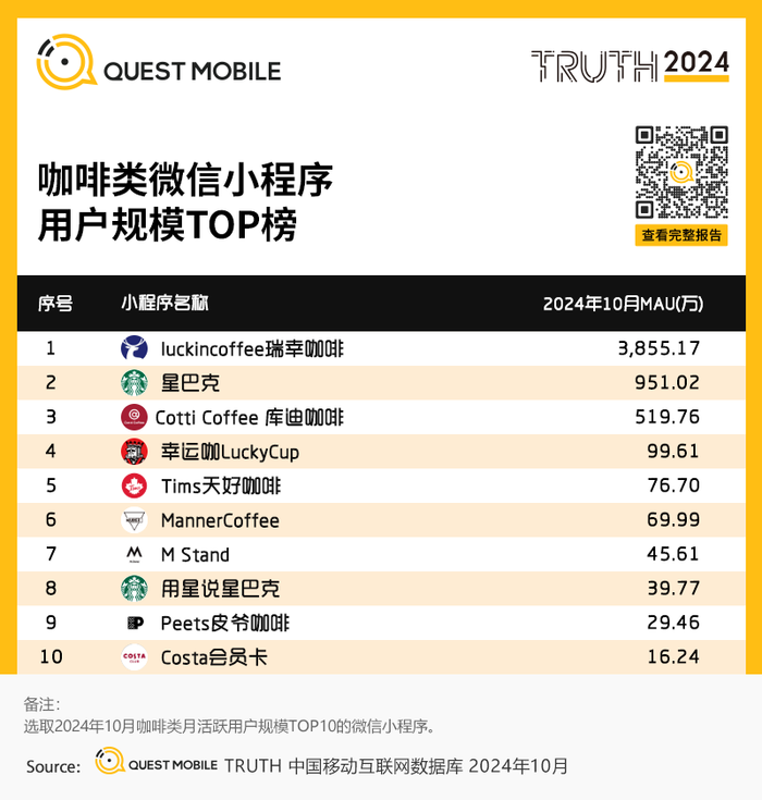 1、咖啡类微信小程序用户规模TOP榜