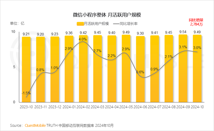 2、微信小程序作为微信流量最重要的载体,2024年10月规模同比增长3%已达9.49亿