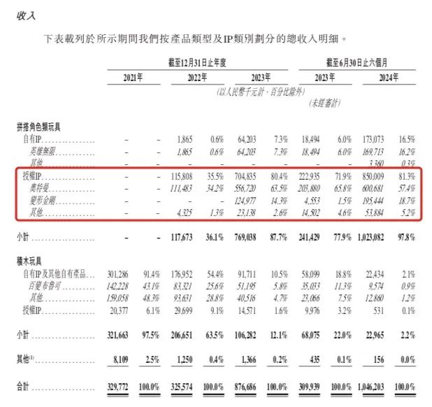 在具体收入来源和营收占比上,拼搭角色类玩具和积木玩具这两大业务呈现出此消彼长的趋势。招股书显示,2022年、2023年及截至2023年及2024年6月30日止六个月,拼搭角色类玩具产品销售产生的收入分别占同期总收入的36.1%、87.7%、77.9%及97.8%,而积木玩具的占比分别为63.5%、12.1%、22.0%及2.2%。