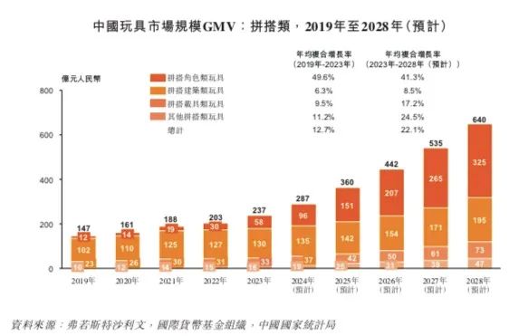 从整个市场来看,“卖玩具”仍然是一门好生意。根据弗若斯特沙利文的资料,中国的拼搭角色类玩具市场从2019年的12亿元增长至2023年的58亿元,年均复合增长率为49.6%,并预期2028年将进一步达到325亿元,年均复合增长率为41.3%。