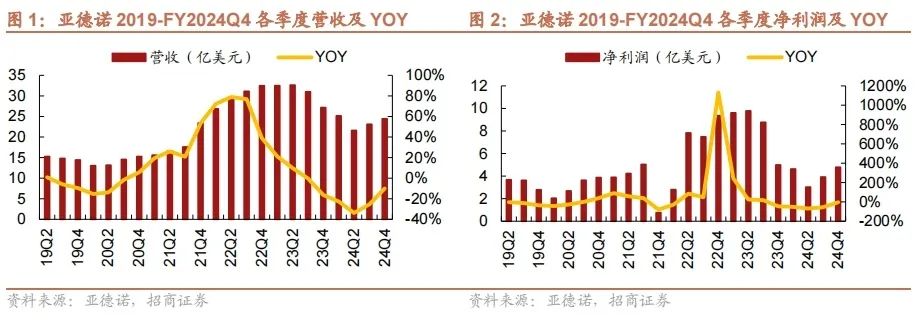 ADI季度营收和净利润正持续修复中,2024财年四季度业绩超出此前预期,虽然同比下滑10.1%,但环比增长5.8%,订单量稳步回升。ADI预计2025年二季度将开始回到正增长轨道,而其2025年的市场复苏将由工业主导。ADI首席财务官表示,尽管宏观不确定性继续限制公司复苏的步伐,但对2025财年的强劲增长仍持谨慎乐观的态度。