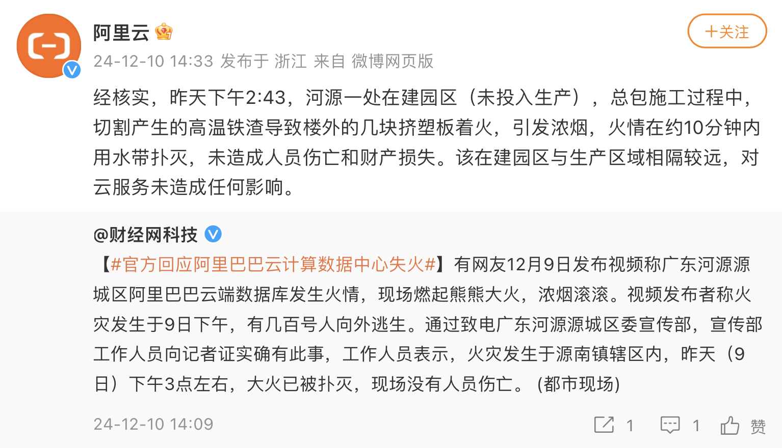 有网友12月9日发布视频称广东河源源城区阿里巴巴云端数据库发生火情。对此,@阿里云 12月10日表示,经核实,昨天下午2:43,河源一处在建园区(未投入生产),总包施工过程中,切割产生的高温铁渣导致楼外的几块挤塑板着火,引发浓烟,火情在约10分钟内用水带扑灭,未造成人员伤亡和财产损失。该在建园区与生产区域相隔较远,对云服务未造成任何影响。