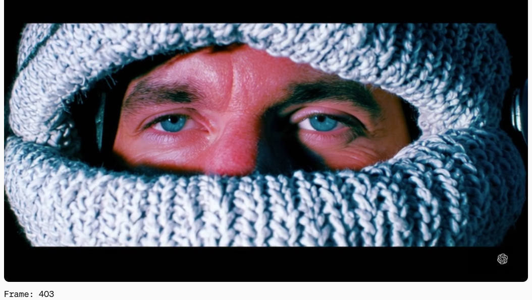 最后在324-440帧,将画面聚焦到宇航员眼睛的特写镜头,他的眼睛被针织面料制成的面罩包裹住。