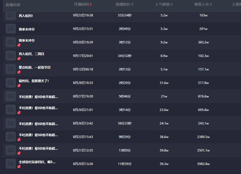 这些水土不服的主播当中,就包括「张大仙」,在加盟抖音之后,张大仙的流量起来的很快,在最初的几个月,人气峰值过20万是常态,但到了8、9月份,除了黑神话那几天较高外,张大仙的人气峰值经常会出现10万以下。