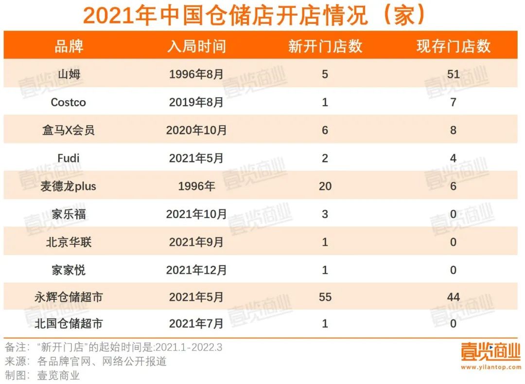 于是,仓储会员店的第二波“热潮”兴起,并在2021年迎来大爆发。这一年,除山姆、Costco等外资企业加速扩张外,包括永辉超市、Fudi、家家悦、家乐福等多家本土实体零售企业也纷纷入局。据壹览商业不完全统计,从2021年到2022年3月底,全国新开业仓储店超过100家。
