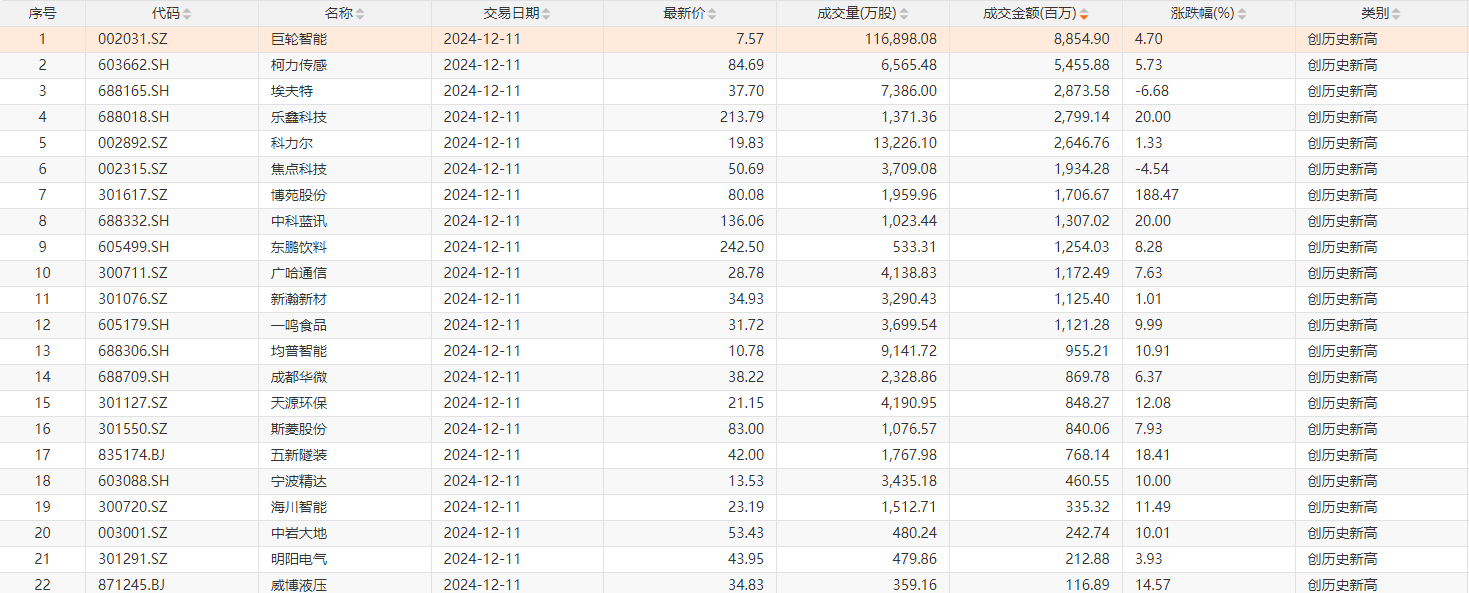 12月11日,Choice数据统计,今日共有22只个股股价创历史新高,主要集中在电子设备、机械设备等行业,包括巨轮智能、柯力传感、科力尔、焦点科技等。