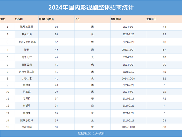 根据已有数据,我们整理出了一份2024年度剧集招商榜单top15。《玫瑰的故事》以82个赞助成为当之无愧的第一名,近十部作品赞助数量超过40个,大盘上升的局势下,去年的吸金王者《以爱为营》在今年的榜单中只能排到第六。