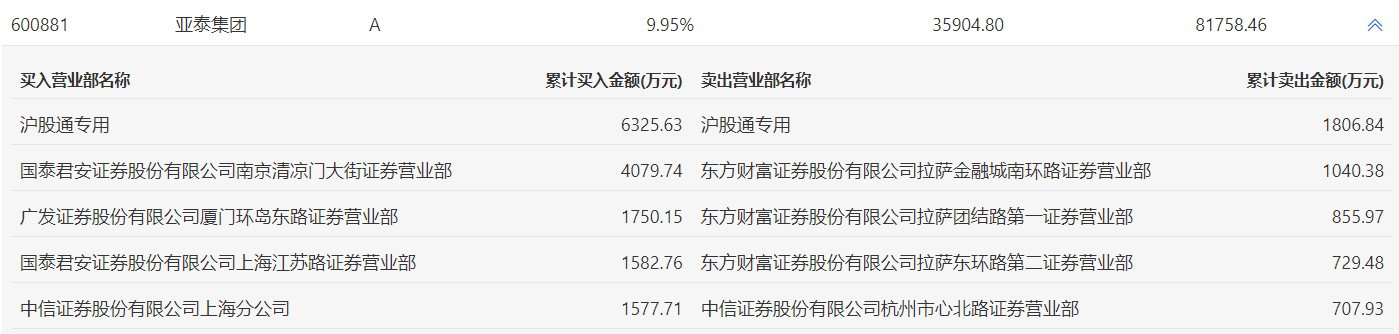 亚泰集团今日涨停,龙虎榜数据显示,上榜营业部席位全天成交2.05亿元,占当日总成交金额比例为25.02%。其中,买入金额为1.53亿元,卖出金额为5140.6万元,合计净买入1.02亿元。