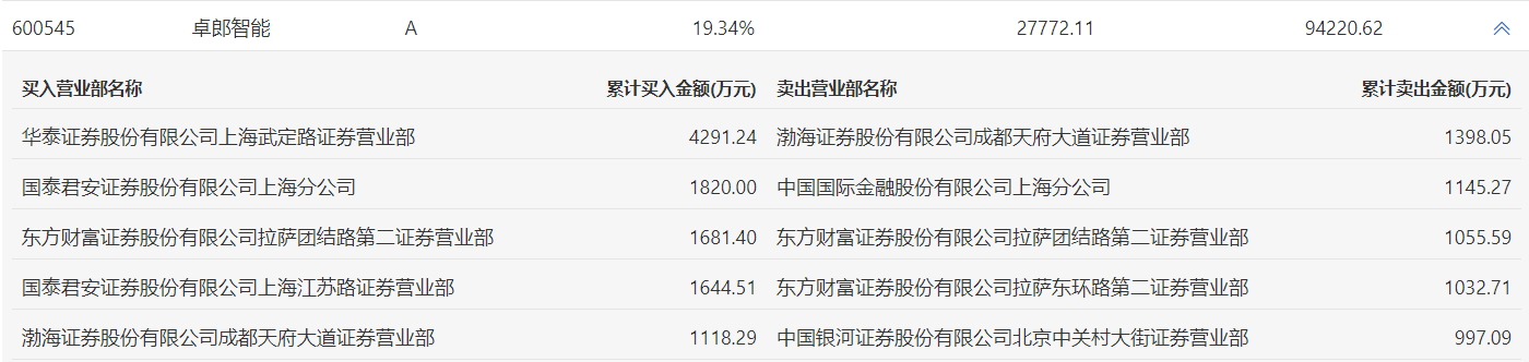 卓郎智能今日涨停,龙虎榜数据显示,上榜营业部席位全天成交1.62亿元,占当日总成交金额比例为17.18%。其中,买入金额为1.06亿元,卖出金额为5628.71万元,合计净买入4926.74万元。