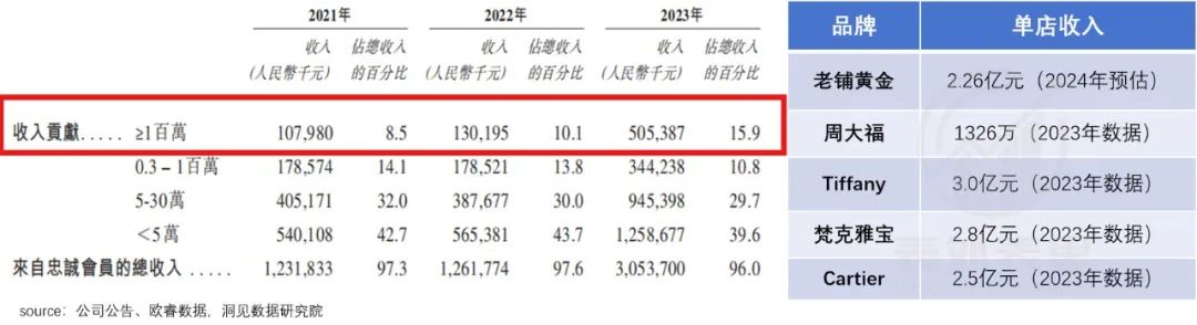 这并非空穴来风,2021-2023年,老铺年购买金额超过100万的会员收入贡献,从8.5%提升至15.9%。