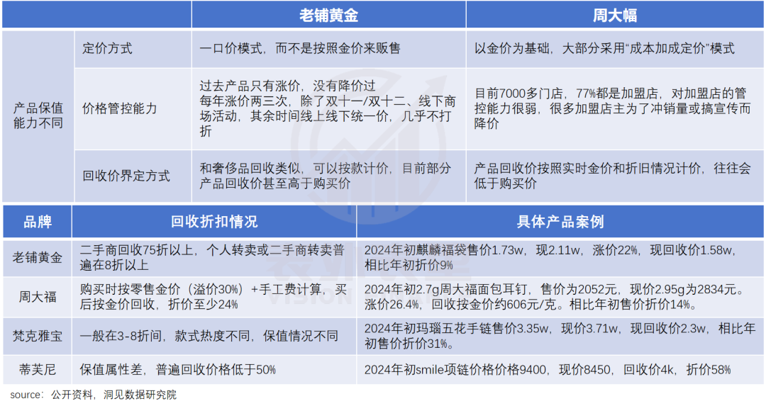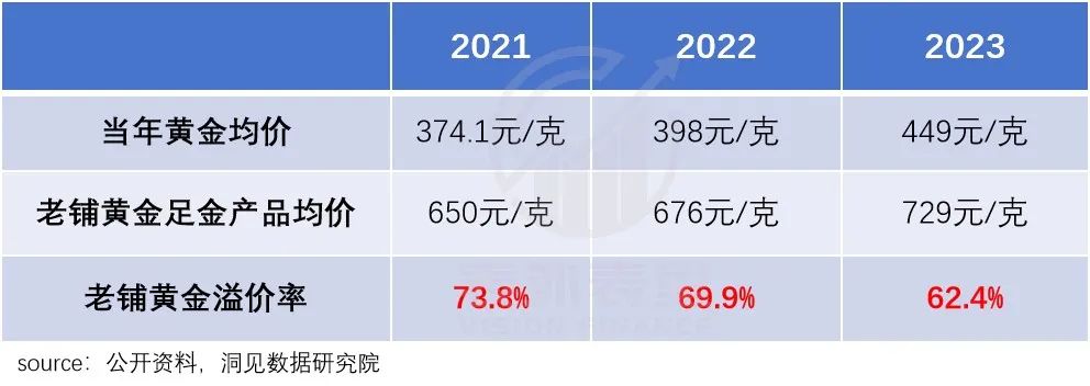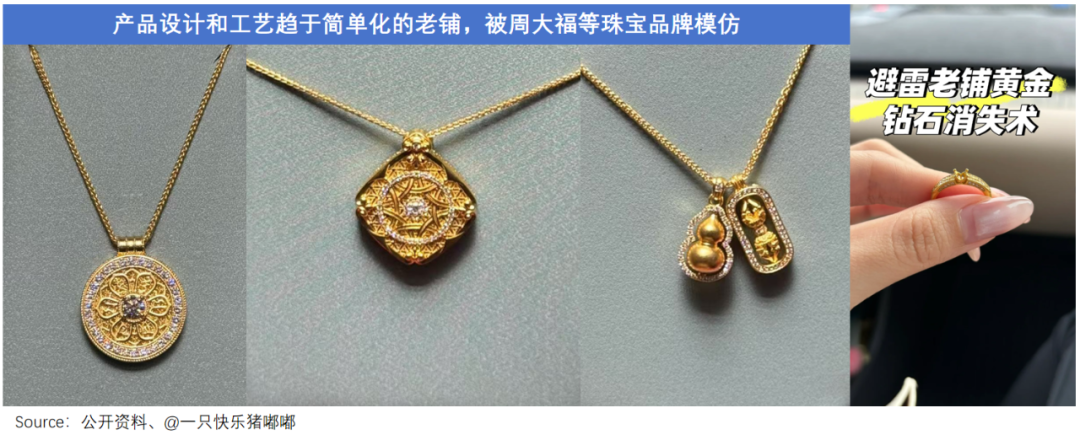 当金价下跌时,不仅老铺的提价能力会受到影响,溢价也会显得更高——周大福和老凤祥等溢价率约30%,老铺在60%-70%。