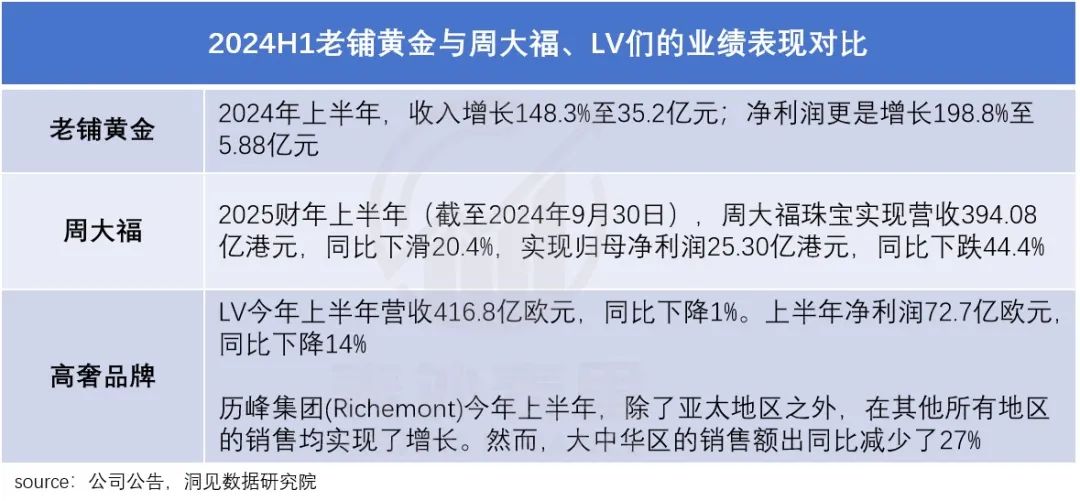 刚过去不久的双11,老铺登顶天猫珠宝销售榜TOP1,成交额同比去年暴涨近400%。更早之前的2024H1,老铺的营收、利润双双大增,表现比LV、卡地亚们都好。