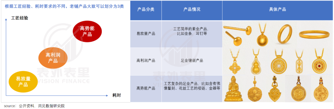 所谓易放量产品,主要为工艺简单的素金产品,如金条、耳钉等;高利润产品指的是足金镶嵌产品,其因镶嵌有珠宝而具备更高的溢价能力。