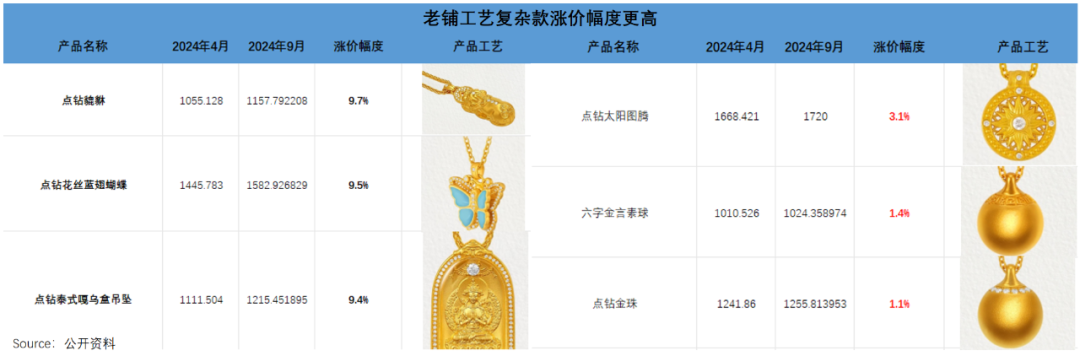 而高品牌势能产品,包括采用花丝、搂胎、錾刻等复杂古法工艺的产品,是最受消费者追捧、涨价幅度更大的一类。