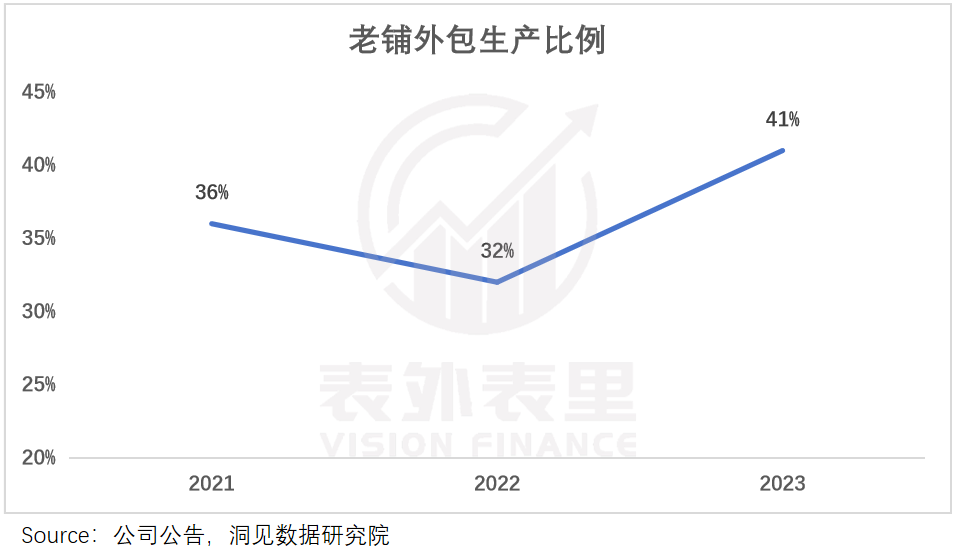 同时,自有产能不够,老铺还喊了外包来凑:将部分镶钻和素金等高利润、易放量产品外包出去,2023年的代工比例提升至41%。