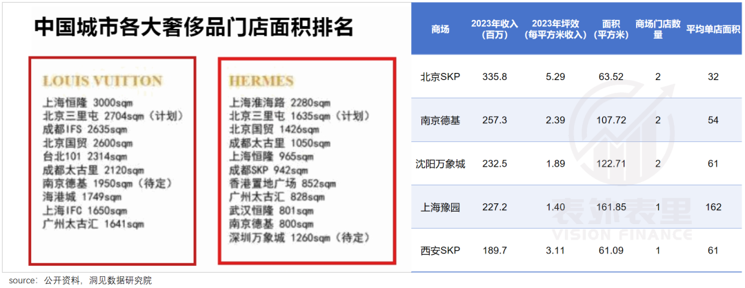 且这还是老铺刻意控制门店面积的结果——和爱马仕们动辄几百、上千平的单店面积相比,2023年老铺前五大购物中心除豫园门店外,面积都只有30-60平。