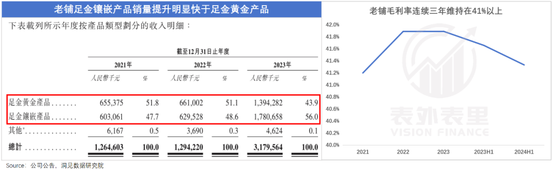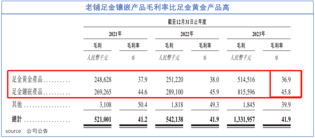 左右开弓下,老铺产品销量咔咔上涨,一定程度上缓解了产能焦虑,甚至在金价大涨、成本飙升的背景下,仍能保持40%+的高毛利。