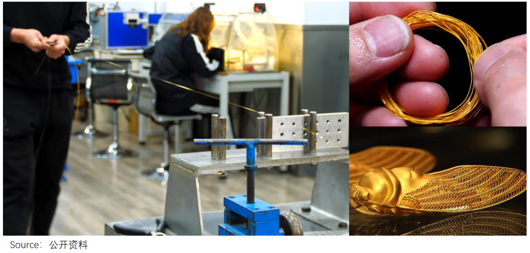 花丝工艺也类似,先把黄金拉成跟头发丝差不多大(直径小于0.3毫米)的细丝,再编织出薄如蝉翼的金蝉等图案。