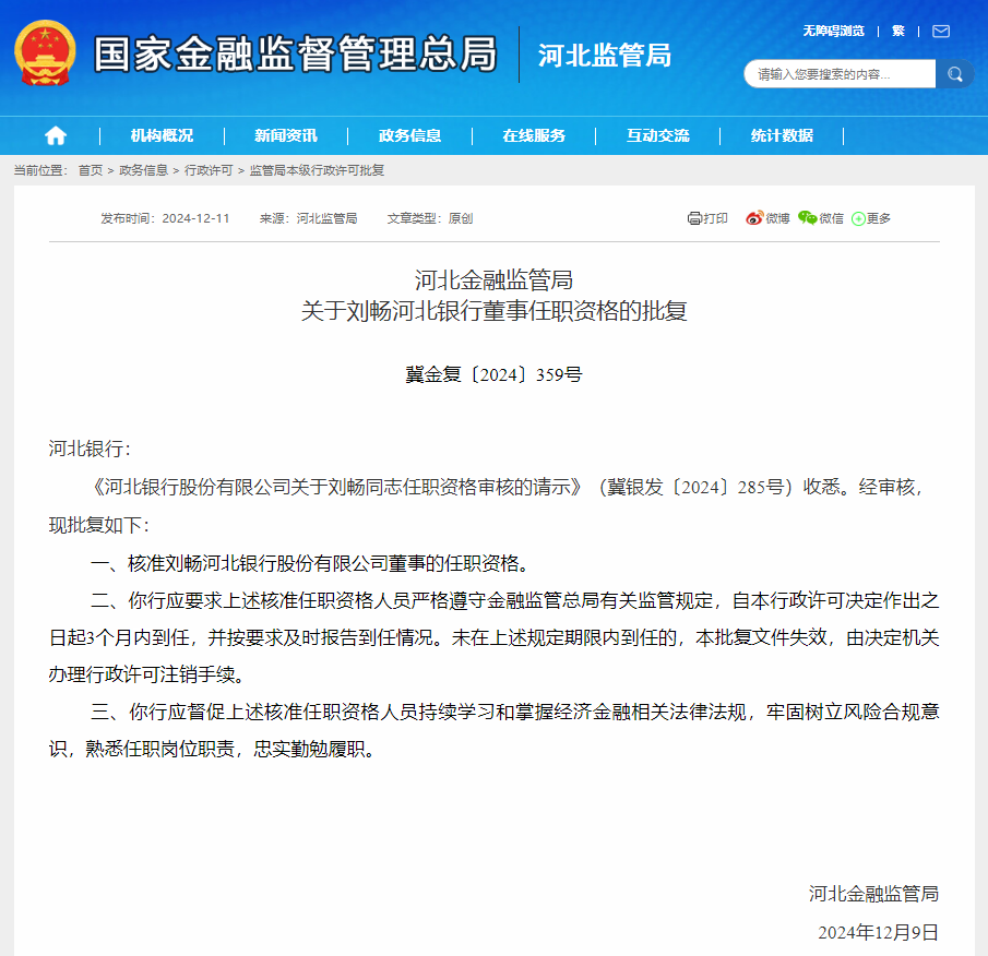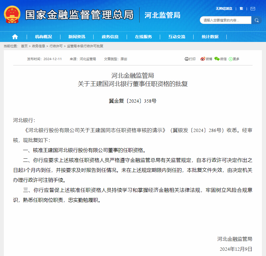 据国家金融监督管理总局网站消息,河北金融监管局核准王建国、刘畅河北银行董事的任职资格。