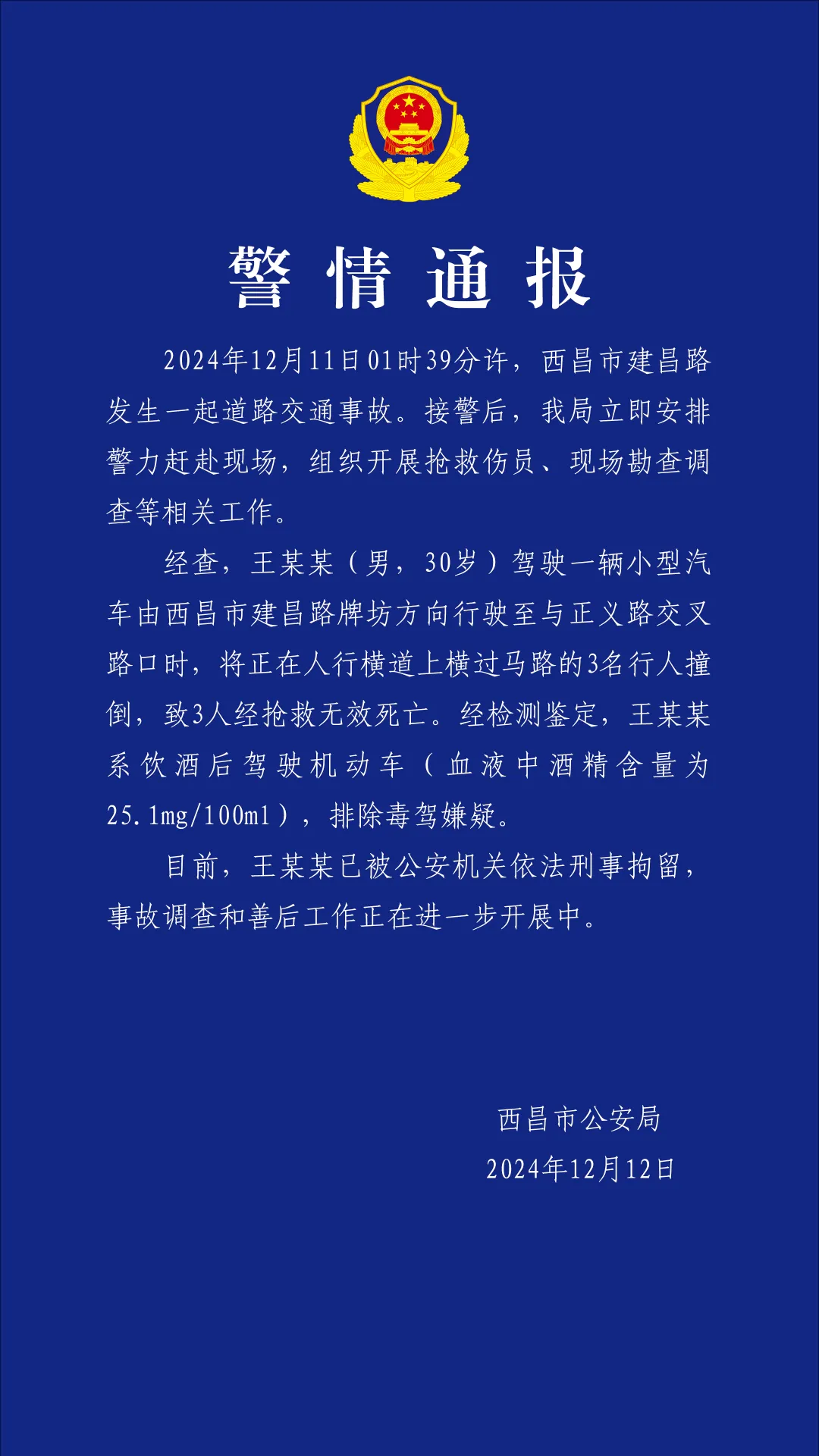 西昌公安通报,12月11日01时39分许,西昌市建昌路发生一起道路交通事故。经查,王某某(男,30岁)驾驶一辆小型汽车由西昌市建昌路牌坊方向行驶至与正义路交叉路口时,将正在人行横道上横过马路的3名行人撞倒,致3人经抢救无效死亡。经检测鉴定,王某某系饮酒后驾驶机动车(血液中酒精含量为25.1mg/100m1),排除毒驾嫌疑。目前,王某某已被公安机关依法刑事拘留。事故调查和善后工作正在进一步开展中。