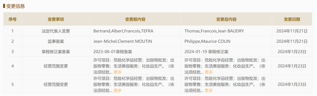 近期,青眼从国家企业信用信息公示平台获悉,路威酩轩香水化妆品(上海)有限公司(下称:LVMH P&C)、路威酩轩香水化妆品(海南)有限公司法定代表人、董事长均从Bertrand,Albert,Francois,TEFRA变更为Thomas,Francois,JeanBAUDRY。