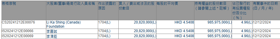 港交所文件显示,12月12日,李嘉诚以平均每股4.5408港元的价格出售2082万股邮储银行H股,持股比例从5.07%降至4.96%。
