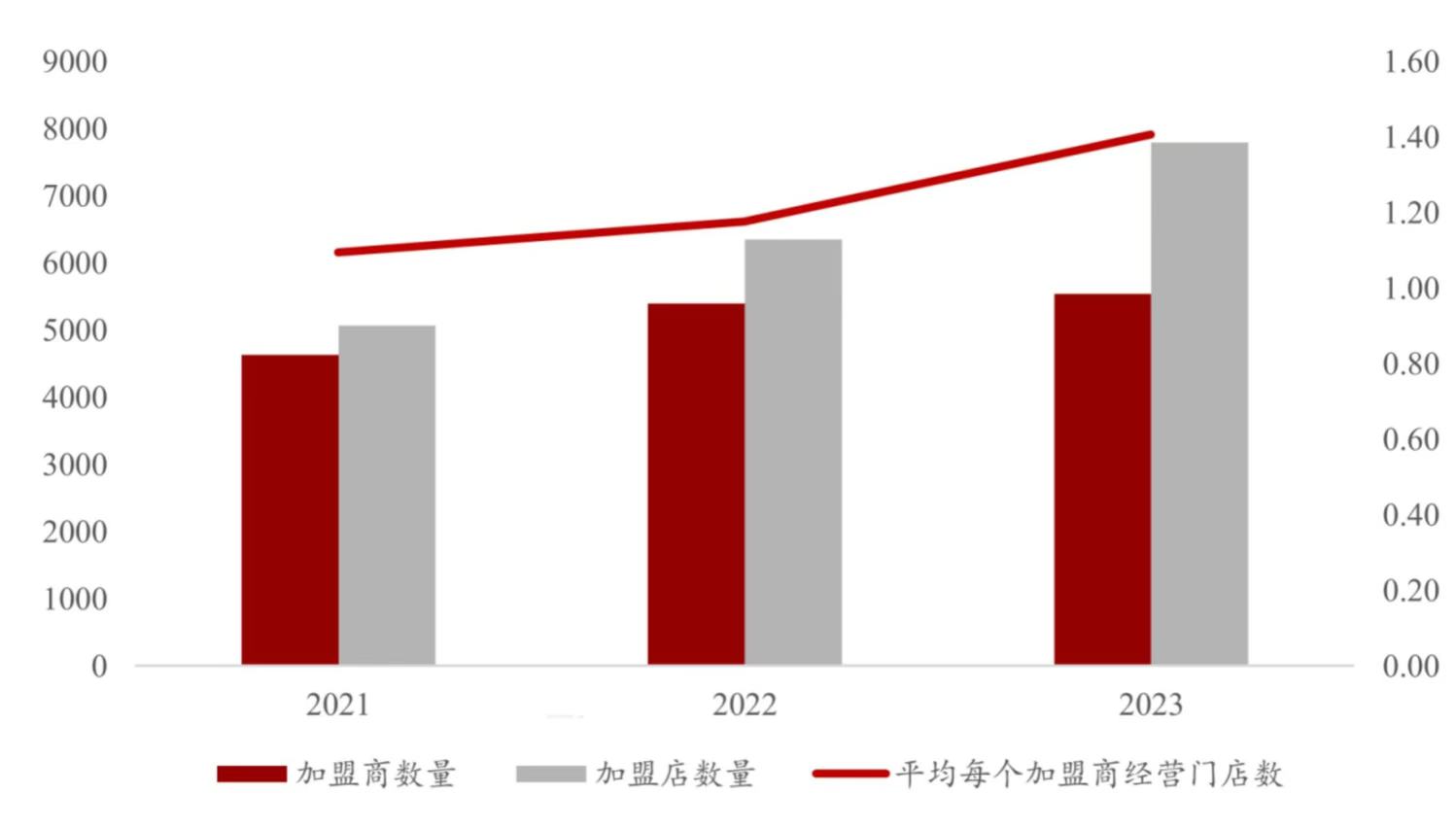 从2020年的2580名加盟商开出2240家门店,到2023年的5591名加盟商开出7111家门店。按照这个数据平均来看,每名加盟商管理的门店数量从0.87家,增长到2023年管理1.27家。