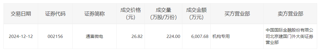 通富微电今日大宗交易折价成交224万股,成交额6007.68万元
