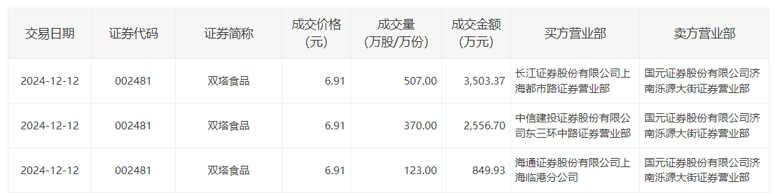 双塔食品12月12日大宗交易成交1000万股,成交额6910万元,占当日总成交额的3.88%,成交价6.91元,较市场收盘价7.12元折价2.95%。