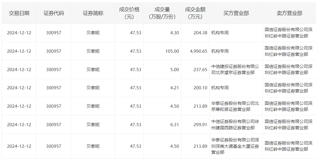贝泰妮12月12日大宗交易成交133.82万股,成交额6360.47万元,占当日总成交额的13.38%,成交价47.53元,较市场收盘价51.05元折价6.9%。