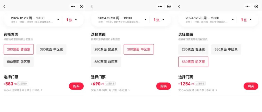 付航演出场地在中国木偶剧院,容纳649个座位,以小程序的票价280-580元价格区间,其一场演出的票房就在18-38万元。