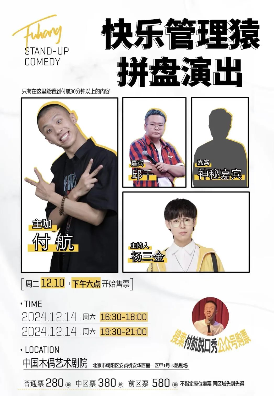 作为新晋的“喜剧之王”,付航依旧保持着高频率高强度的演出模式,节目之后,每个月有10场左右《快乐管理猿》的“拼盘”演出,而这个拼盘演出因为“主咖”仍是付航,观众也都是为了“文明观猴” ,因此与专场的性质差异不大。
