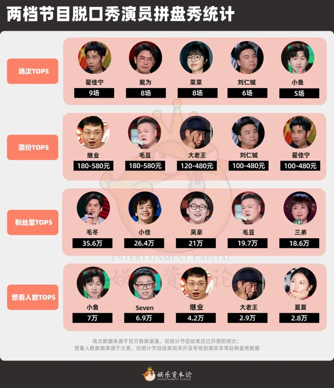 在《喜单》中击败刘旸进入四强的选手刘仁铖,作为黑马新人,尽管未能一举跻身头部演员的行列,但在拼盘领域,其在场次以及票价等方面均闯入TOP5,这也显示出综艺对于脱口秀纯新人的加成相当可观。