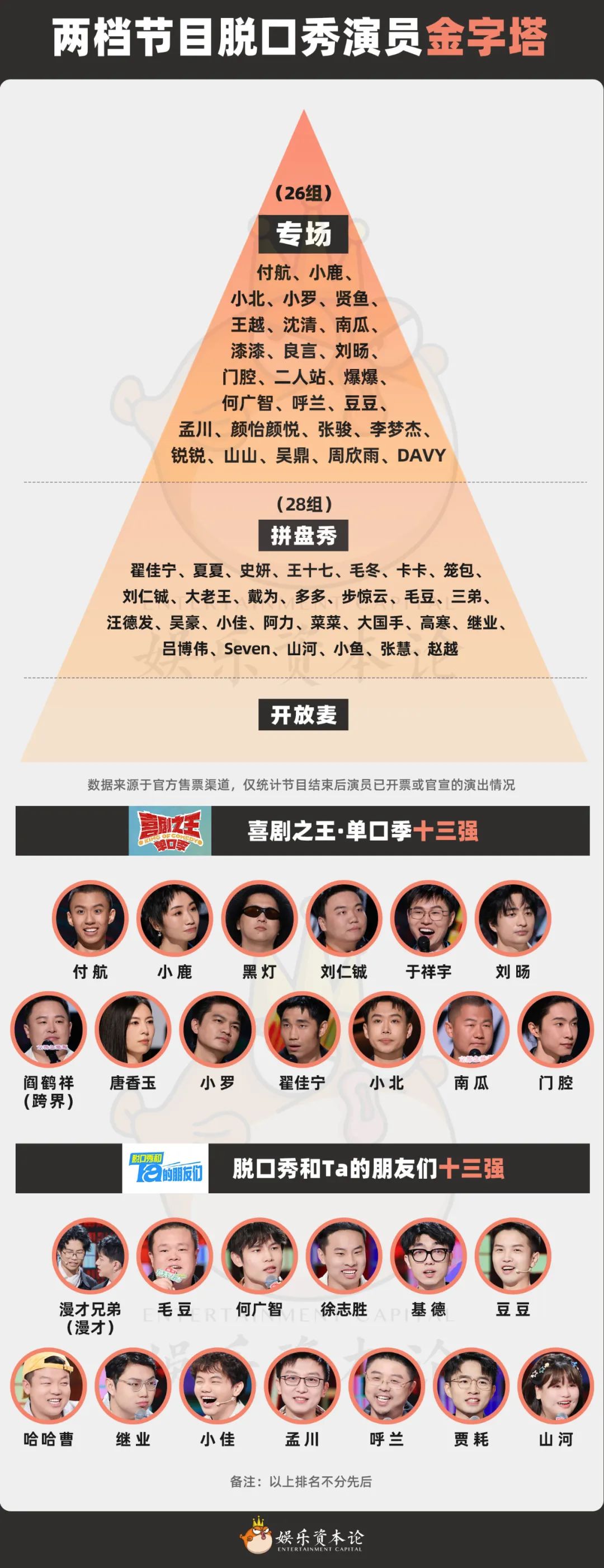 曾经与脱口秀紧密联系的李诞、王建国、杨笠、庞博们纷纷转向其他方向时,两档节目推出的新人们已然填补了这个空缺,线下演出饱和,商务活动不断。如果把脱口秀行业比作金字塔,那么毫无疑问,金字塔顶的人已然换了一波。