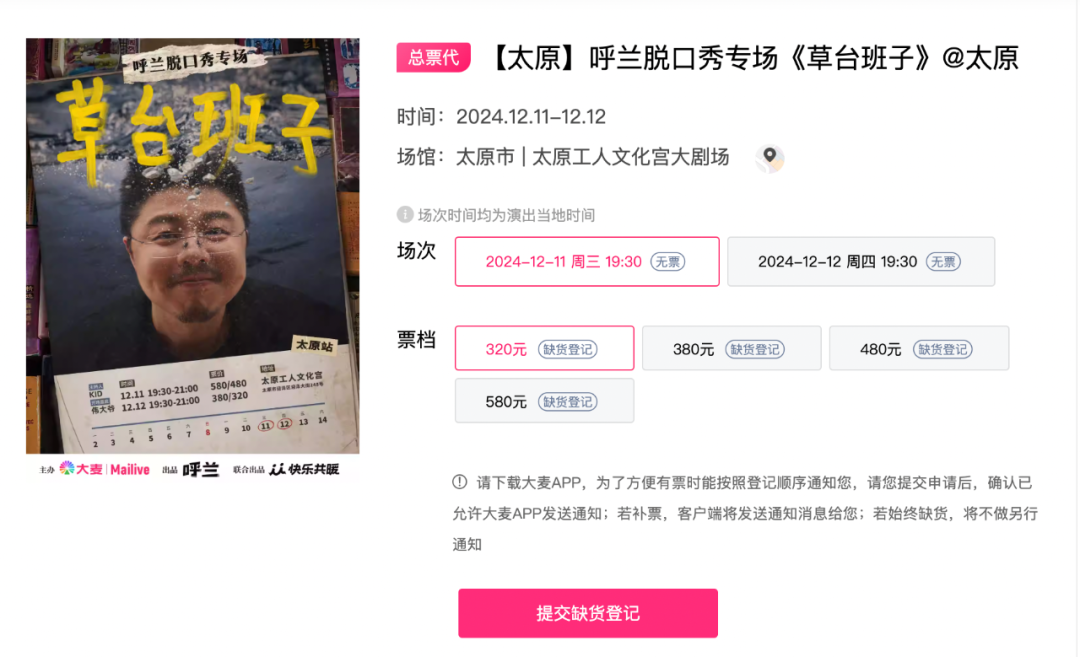 《脱友》那边,呼兰、何广智等老将依旧“抗打”,呼兰在11月官宣了新的专场《草台班子》,将在6个城市巡演,票价也拉高到320-580元。