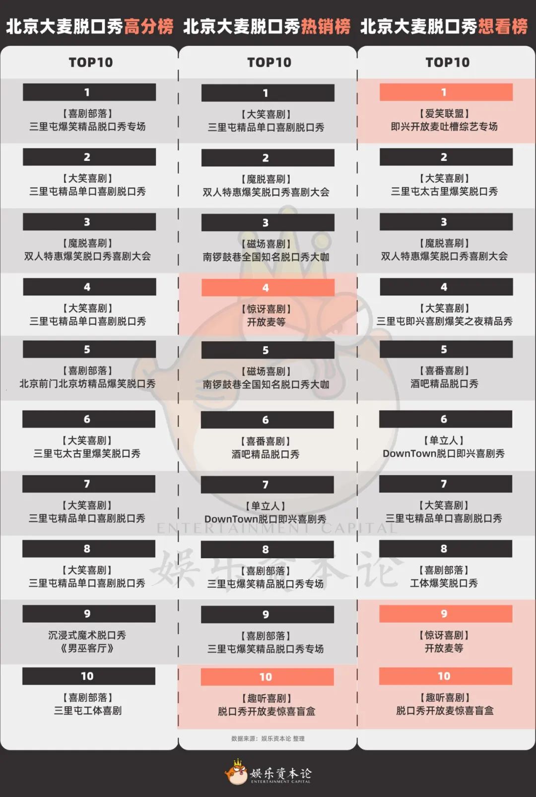 在大麦平台搜索“主打秀”“拼盘秀”“开放麦”等关键词,开放麦演出相对其他演出类型数量更多,覆盖城市也更为广泛。但大麦数据显示,在北京地区热销与想看人数TOP10中,仅有惊讶喜剧、趣听喜剧等有开放麦上榜,而高分榜上却难觅开放麦身影。在这个层面上,开放麦演员想要再往上走一步,仍要经历更长的路径。
