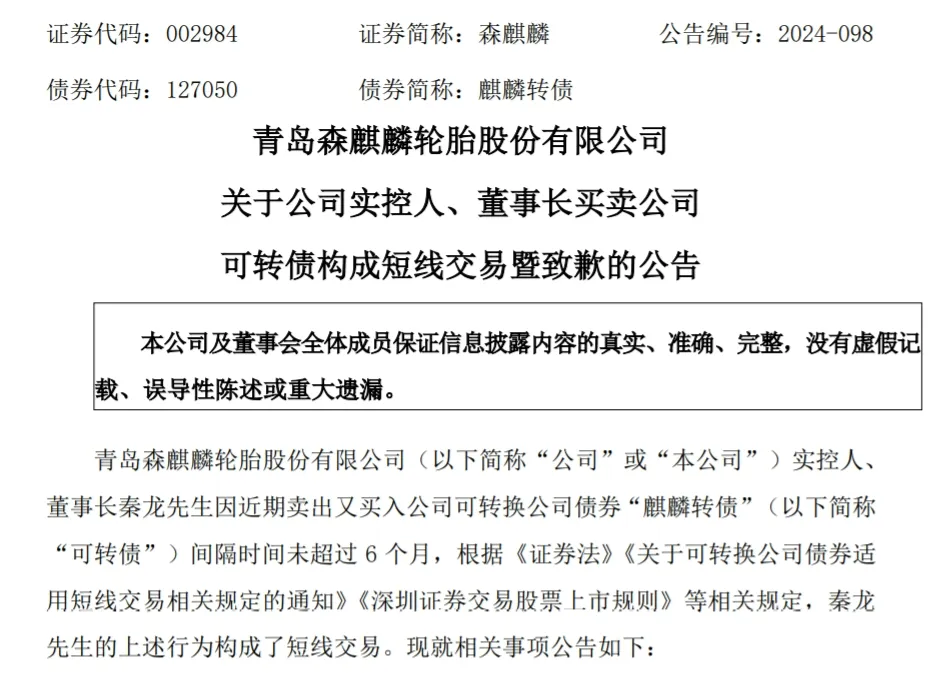 而在一个月后,森麒麟发布公告称,公司实控人、董事长秦龙,因涉嫌短线交易收到中国证券监督管理委员会做出的立案告知书,同时秦龙还因上述违规行为,受到深交所的通报批评处分。