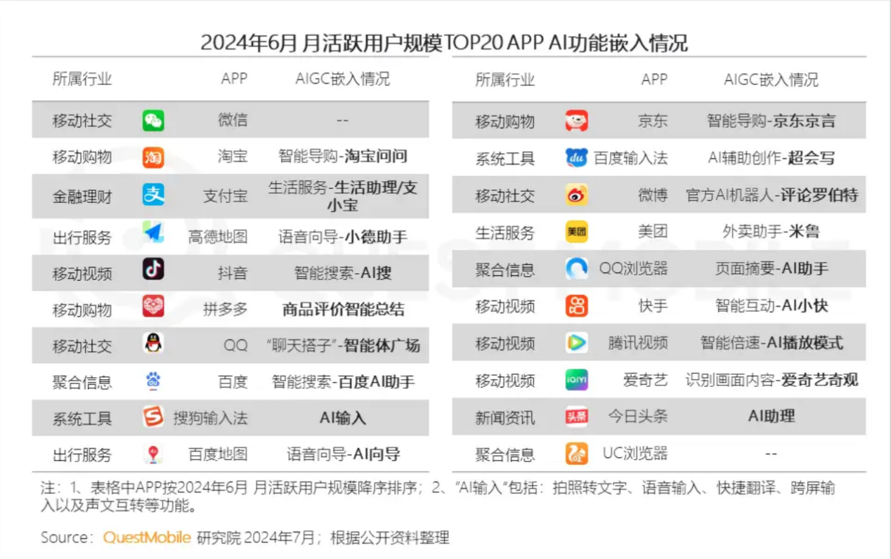 根据QuestMobile发布的《2024年中国移动互联网半年大报告》,全网头部APP在AI领域持续布局,绝大多数已嵌入AI功能,涵盖智能导购、智能助理、智能搜索、智能向导等多方面功能。在月活跃用户规模TOP 20中,智能搜索加持的百度APP排名第八,另外,出行产品上,百度地图被高德地图超过,只能屈居第二,而在输入法上,百度输入法也一直被搜狗输入法稳稳压住一头。