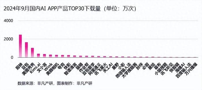 另外,在2024年9月的AI移动应用市场下载量榜单中,剪映、豆包、美图秀秀斩获国内前三名,同时,剪映、美图秀秀、豆包也是国内APP端活跃用户规模的前三名,而文小言排到了第五。