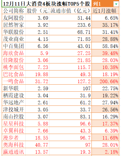 消费热门股多是低价小市值个股,近1月最大涨幅200%