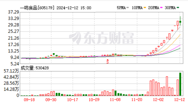 值得注意的是,这只个股9.24行情前股价低于9元。从11月26日起,其股价连拉12个涨停,从10元附近一口气涨到30元以上,总市值也从40亿元猛涨到120亿以上。由此可见,运作一鸣食品的资金,炒作手法十分凶悍。