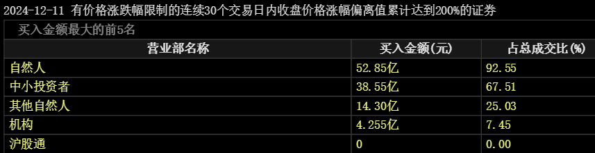 盘后发布的龙虎榜数据显示,截至12月11日,近1个月一鸣食品的买方,以自然人为主,占比高达92.55%;机构占比仅7.45%。也就是说,这只近期热门股的上涨,与机构关系不大,更没有基金什么事。