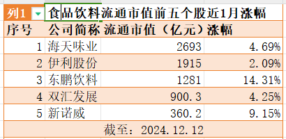 以食品饮料流通市值前五个股为例,截至12月12日,流通市值最大的海天味业涨幅4.69%,市值排名第二的伊利股份涨幅仅2.09%。同期,食品饮料板块涨幅高达19.6%。由此可见,基金重仓股与游资炒作的个股,真的是一边是冰山,一边是火焰。