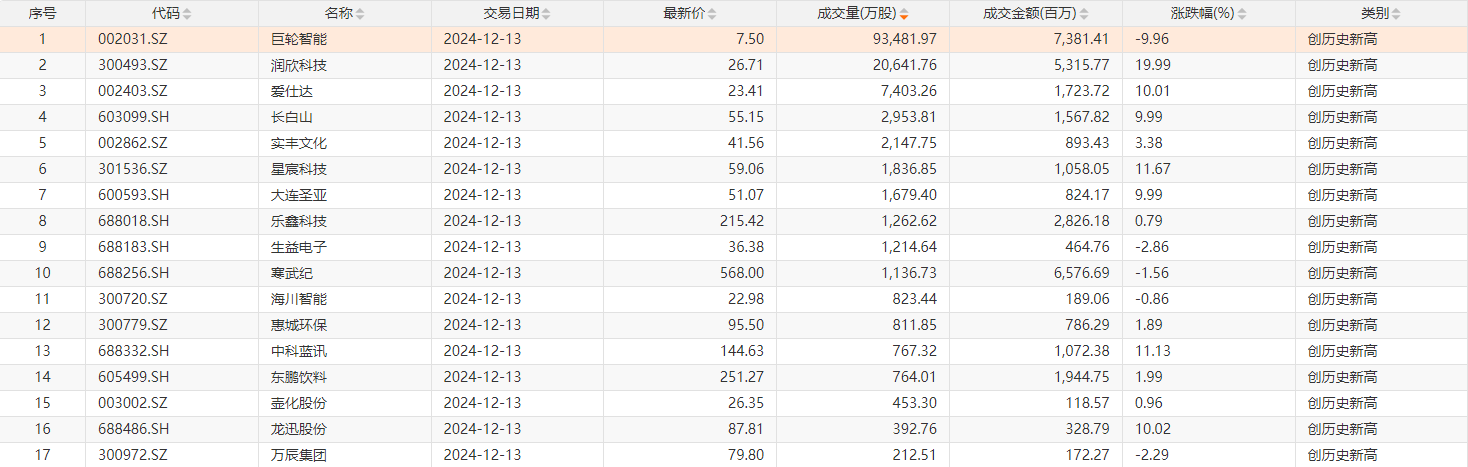12月13日消息,Choice数据统计,今日共有17只个股股价创历史新高,主要集中在电子设备、机械设备等行业,包括巨轮智能、寒武纪、长白山、实丰文化等。